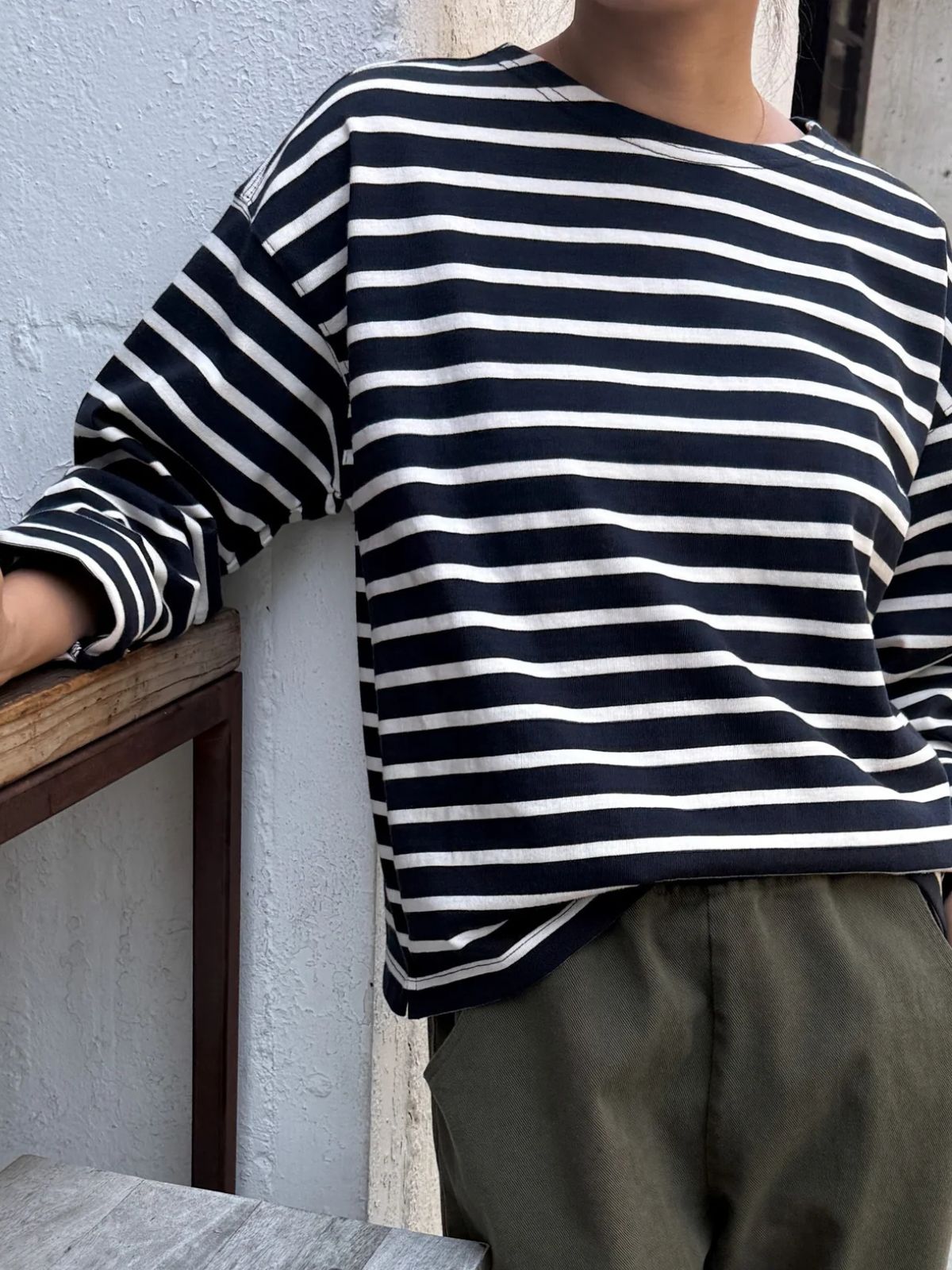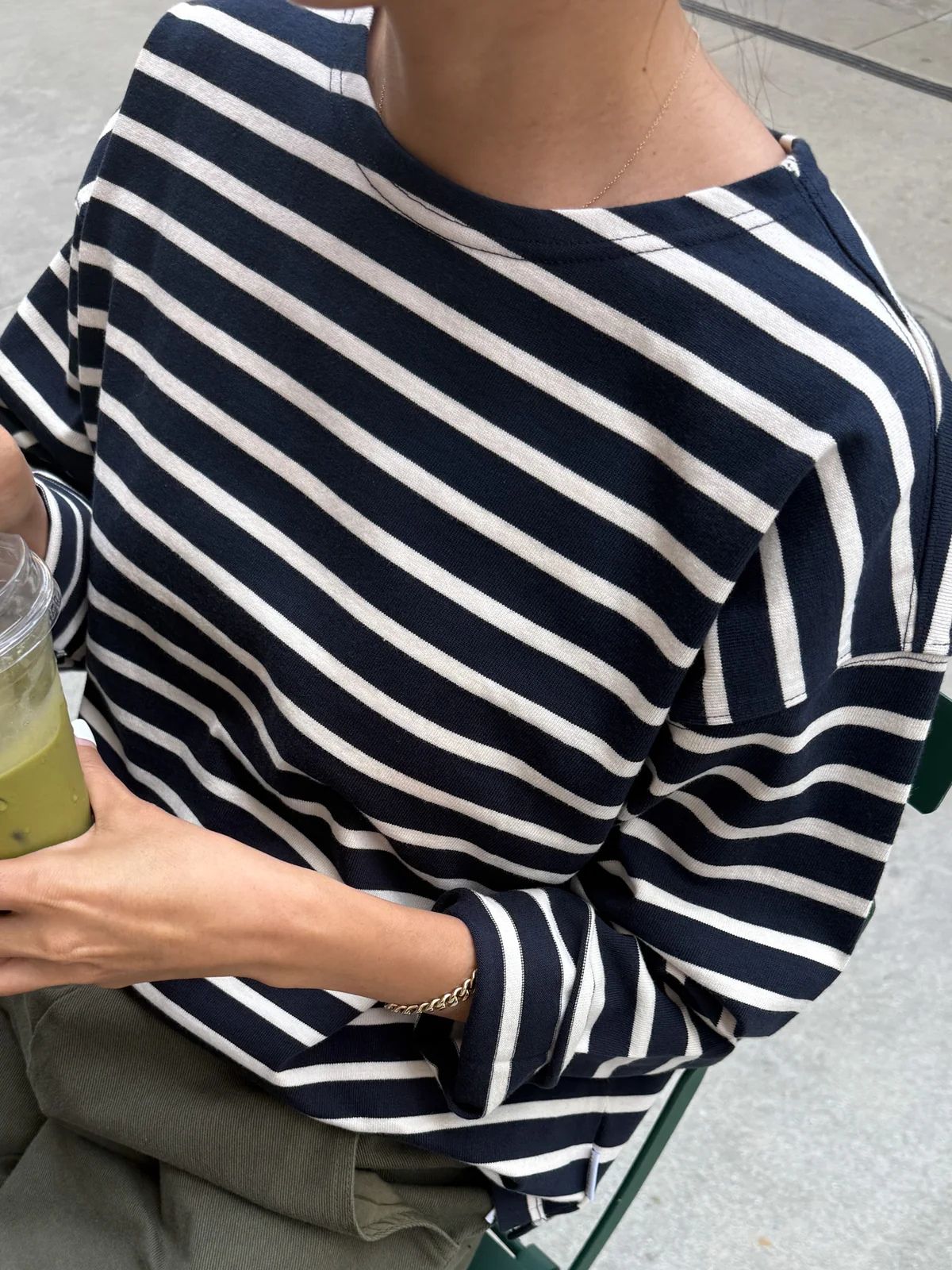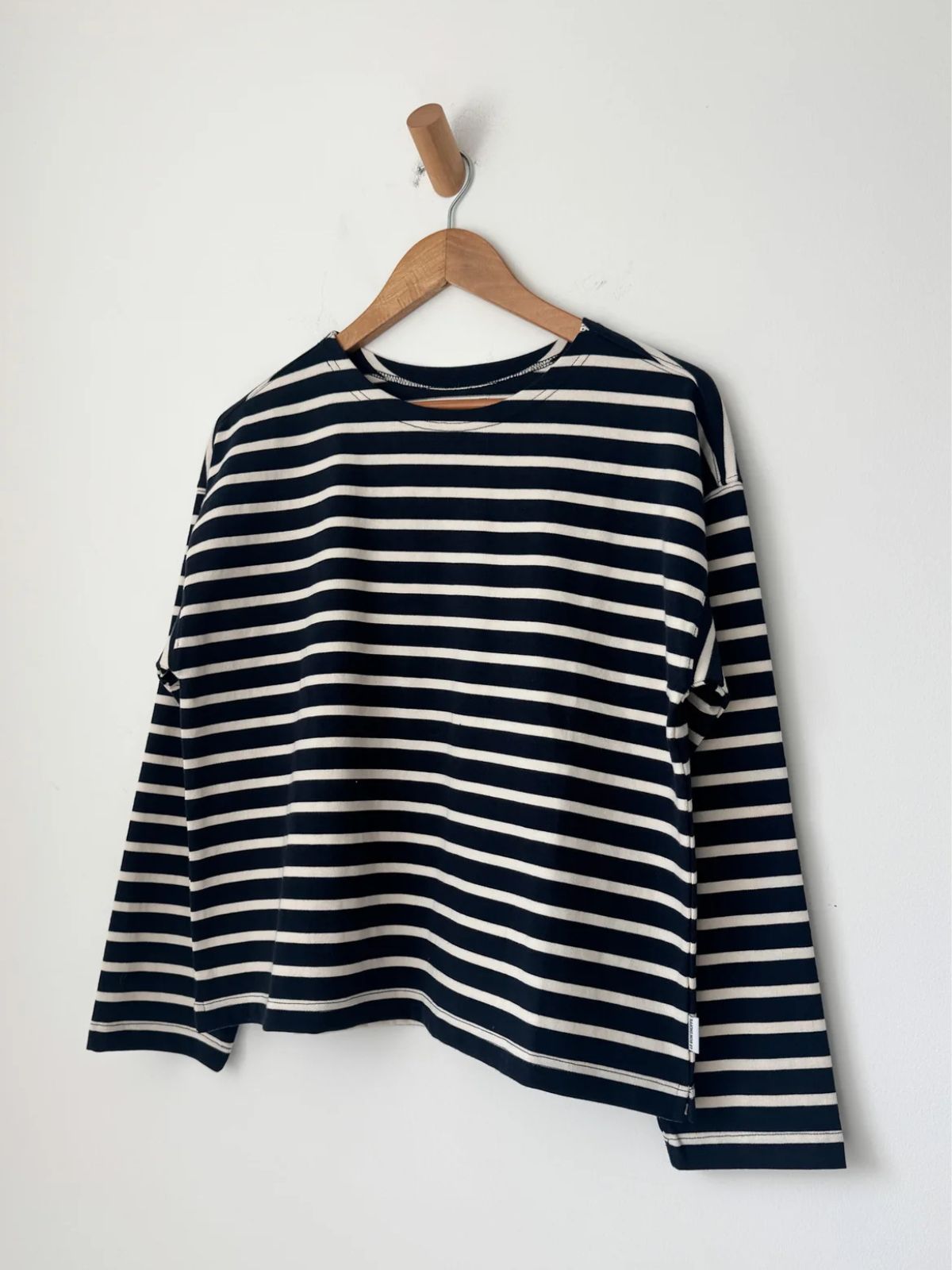 The Sailor Stripe Top in Navy offers a refined take on nautical style with its Breton stripes and classic boxy silhouette. Updated with a flattering round neckline and a slightly cropped length, this long-sleeve design effortlessly complements high-waisted bottoms for a polished, elegant look. Perfect for those seeking timeless sophistication with contemporary appeal.