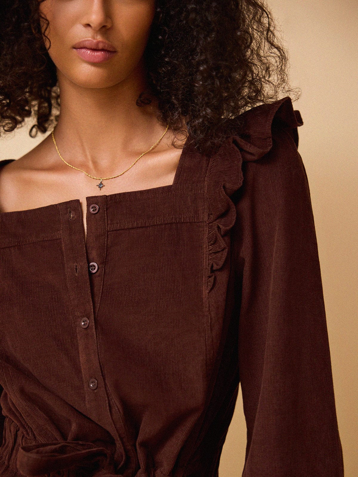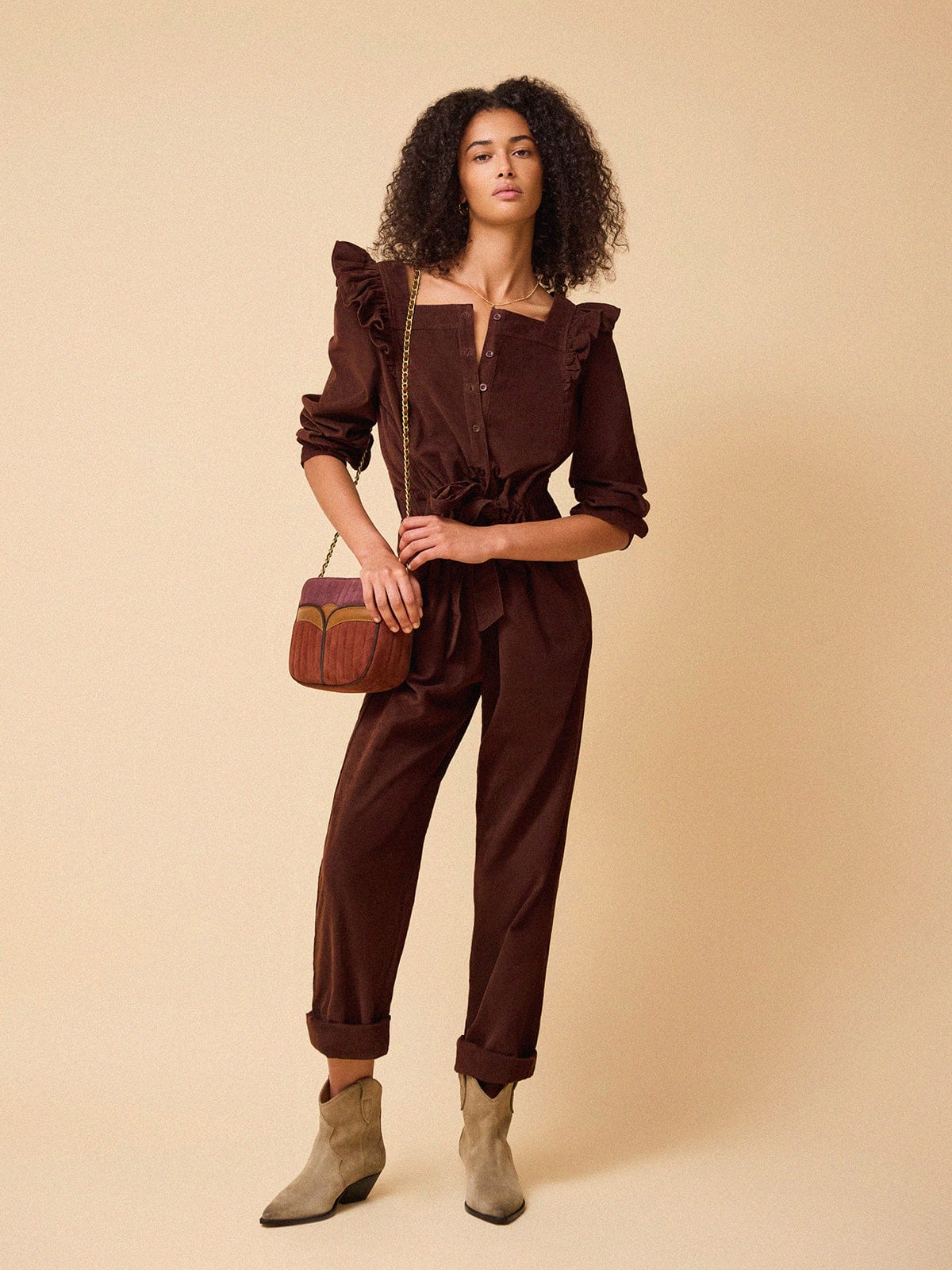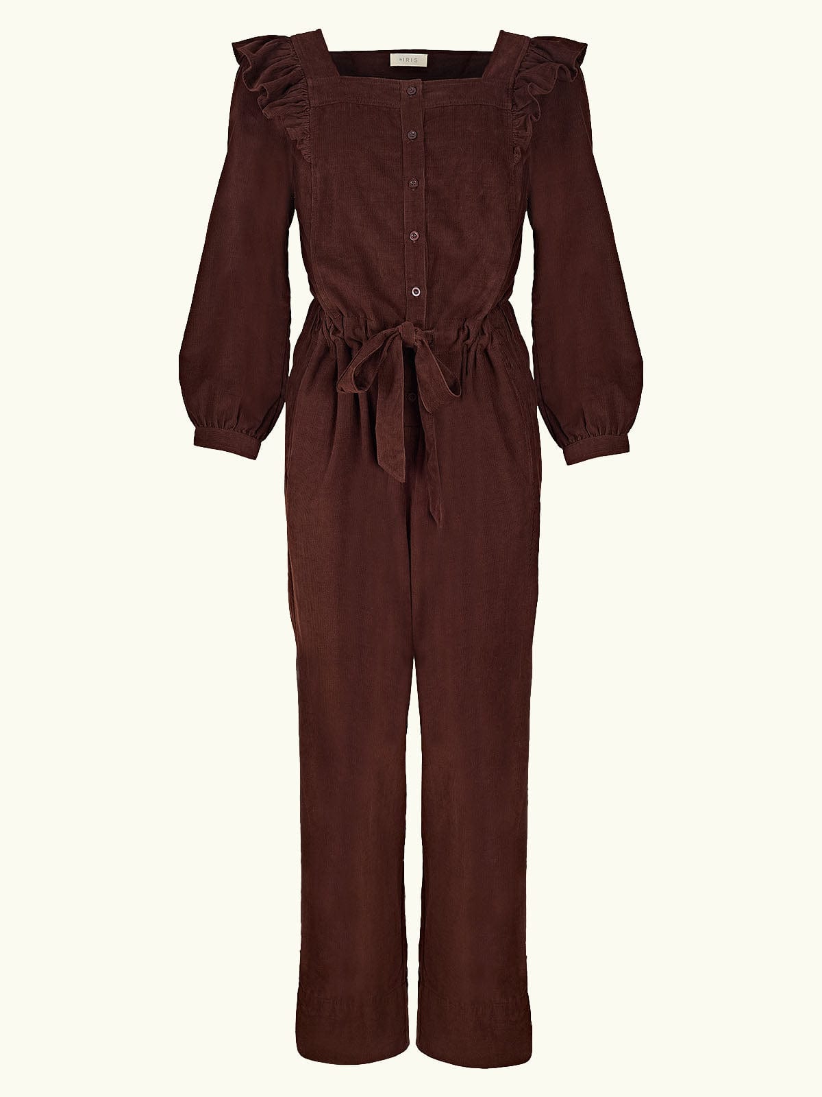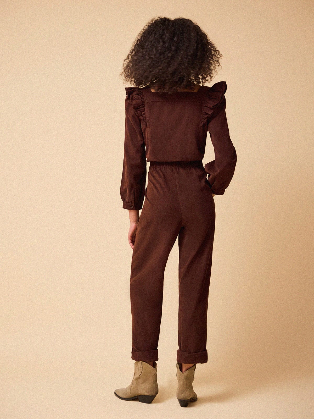 With her ruffled shoulders, square neckline and cinching waist-tie, Sasha is our bestselling jumpsuit year in and year out. This season she has been reimagined in an impossibly chic, chocolate-brown needlecord.