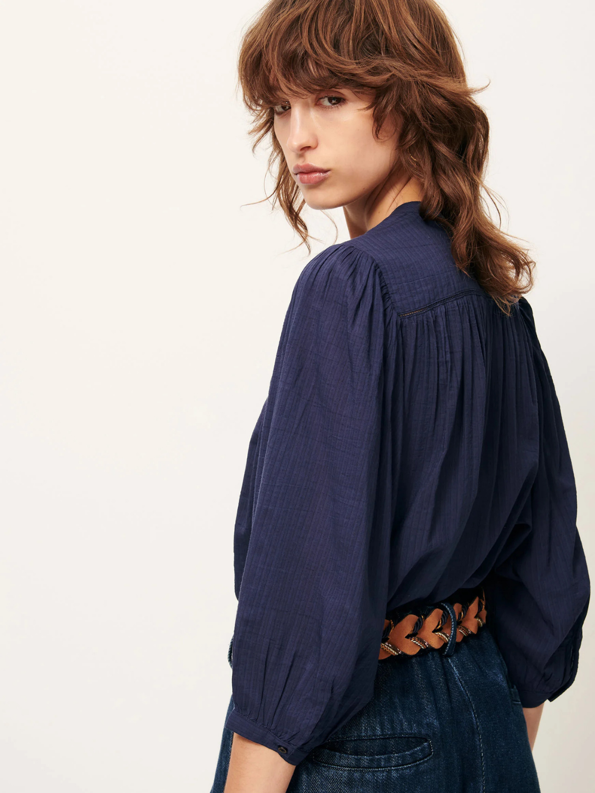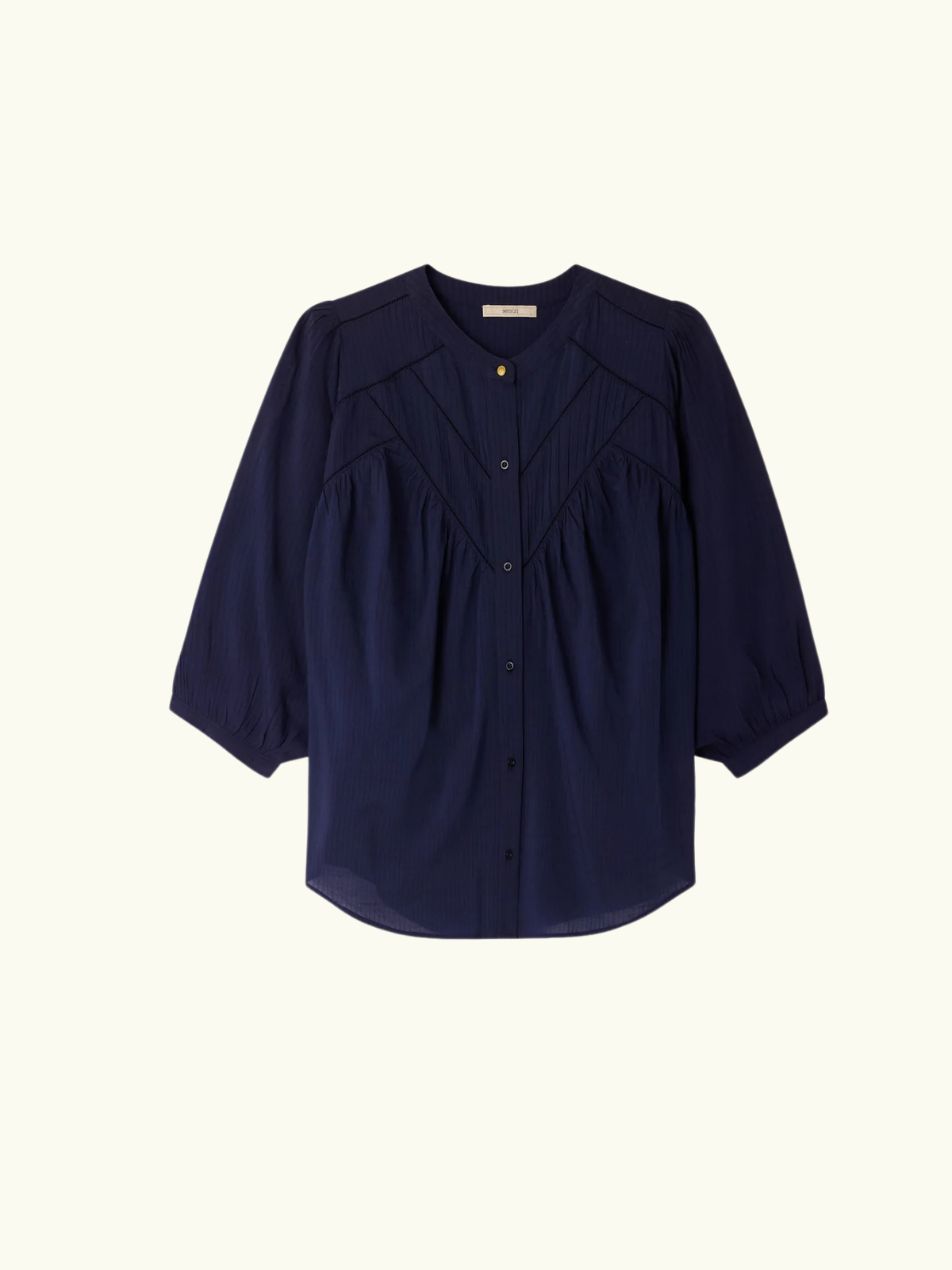 The Savi Balloon Sleeve Blouse in Indigo combines elegant balloon sleeves with intricate ladder stitch and mini knife pleat details. Made from jacquard-textured lawn fabric enriched with fine contrasting stripes, it delivers a subtle yet sophisticated texture. This best selling blouse is thoughtfully designed for a chic refined silhouette, ideal for elevating any look with effortless style. Comes in Indigo navy and cream