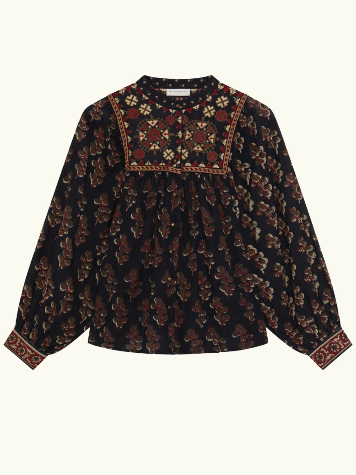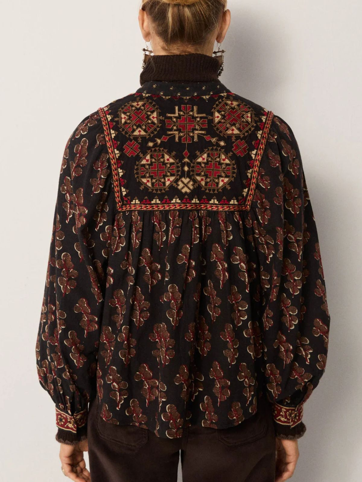 The Scarlet Embroidered Blouse in dark brown adds a playful bohemia pop to your wardrobe with its soft, airy cotton voile fabric. Designed with a relaxed fit, it offers a comfortable, flowing silhouette that moves with you. Delicate scarlet florals unfold across the fabric, highlighted by a contrasting geometric yoke for a fun, unexpected twist. Gentle gathers at the shoulders bring a handcrafted feel, making this blouse a charming blend of timeless elegance and everyday joy.