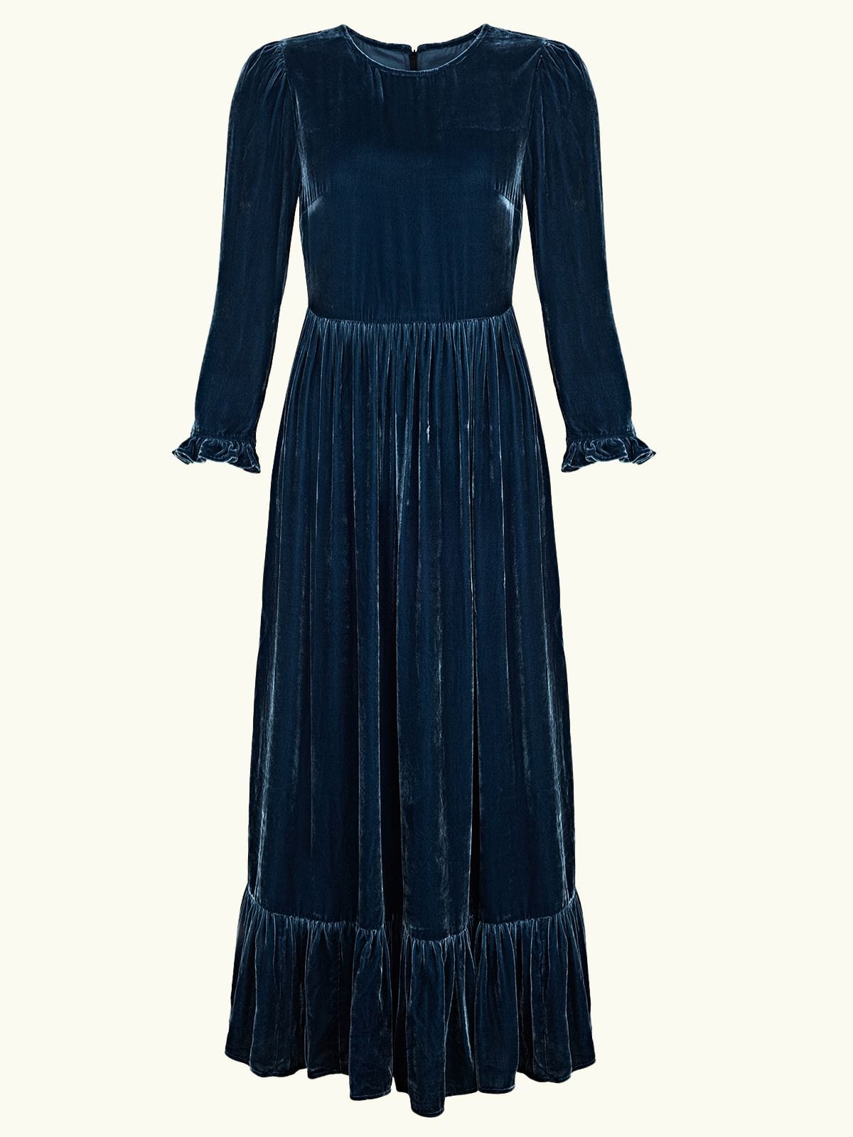 The Shae maxi dress is an Iris Icon, reimagined this season in a petrol blue velvet that has been blended with silk to bring unmatched luminosity and softness to this seasons favourite fabric.