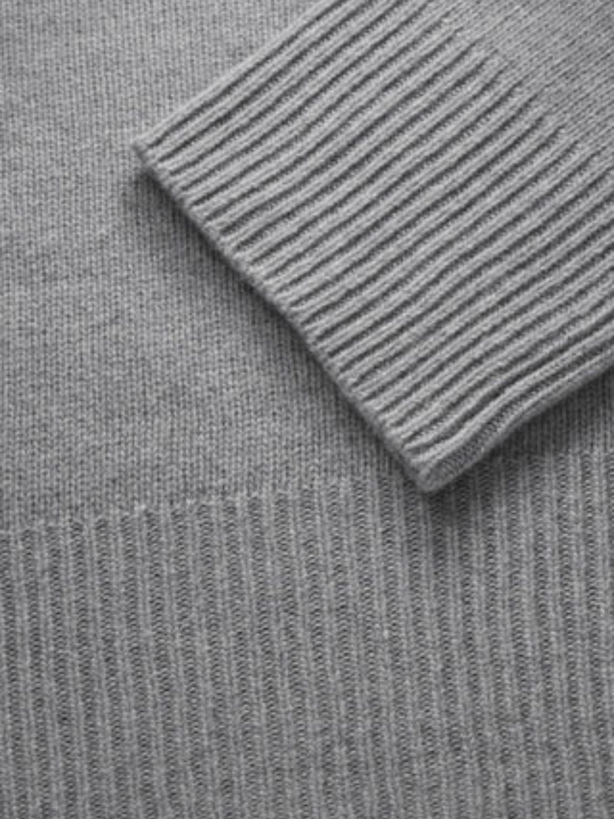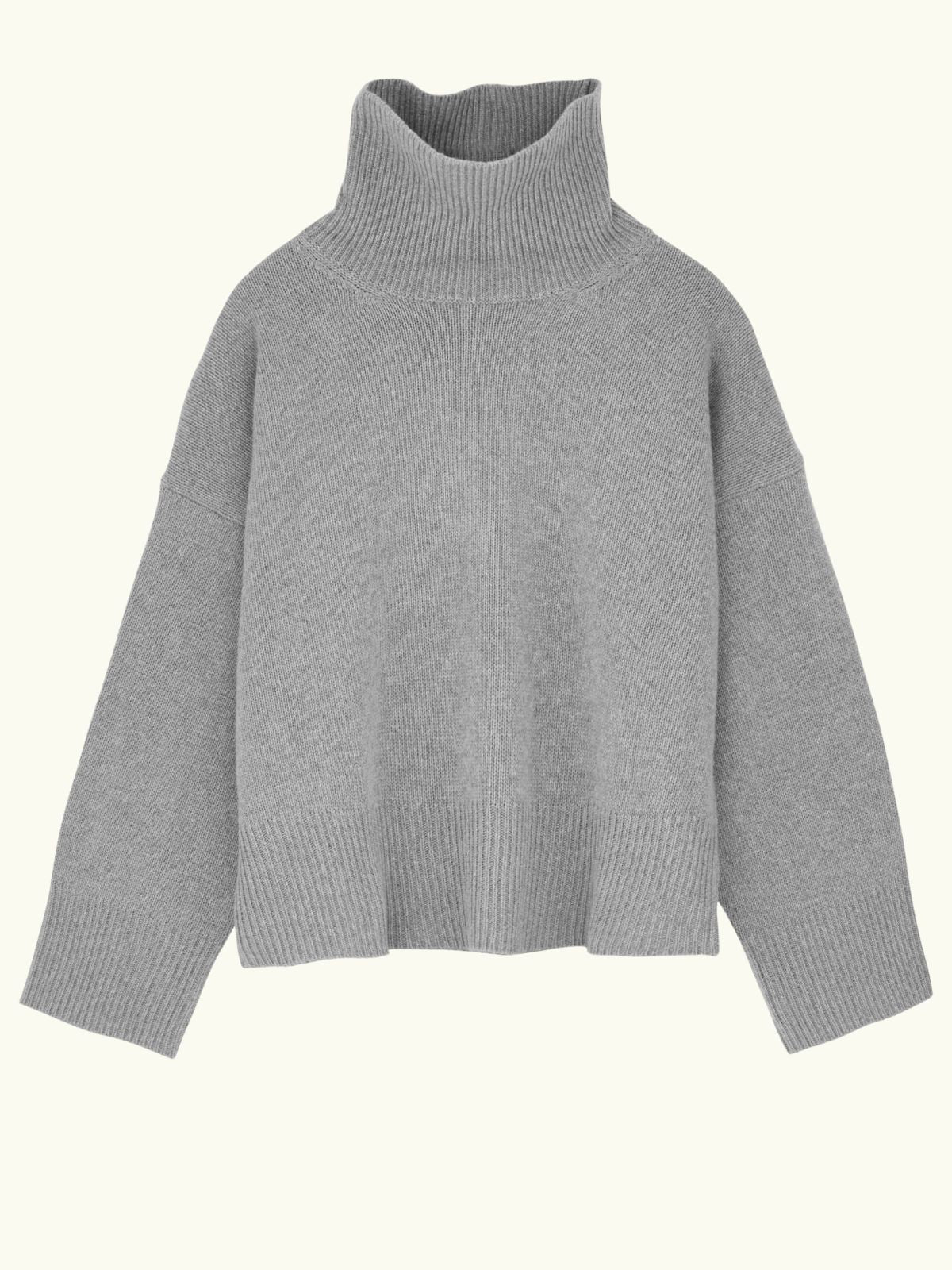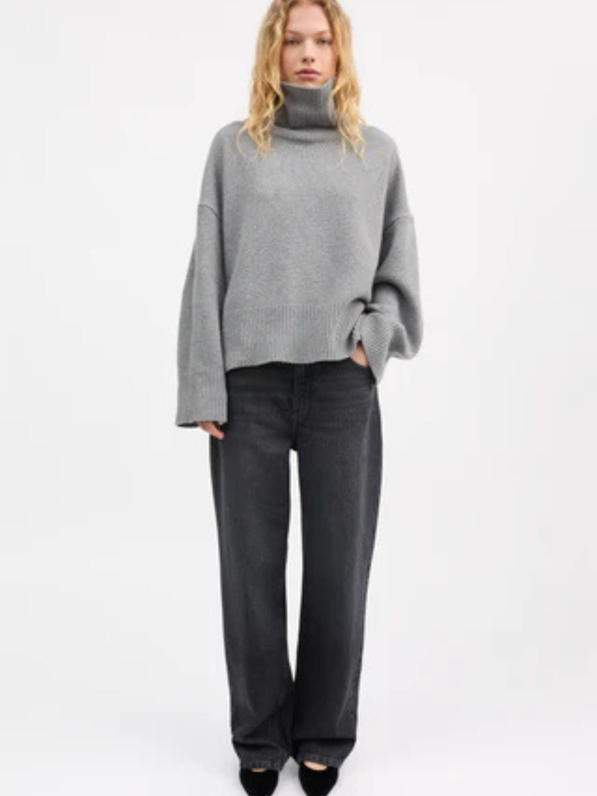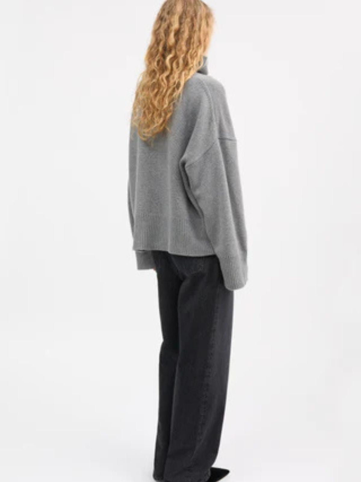 Silene T-neck is an oversized knit crafted from exclusive grey merino wool. The knit has a T-neck, dropped shoulders and ribbed hems.