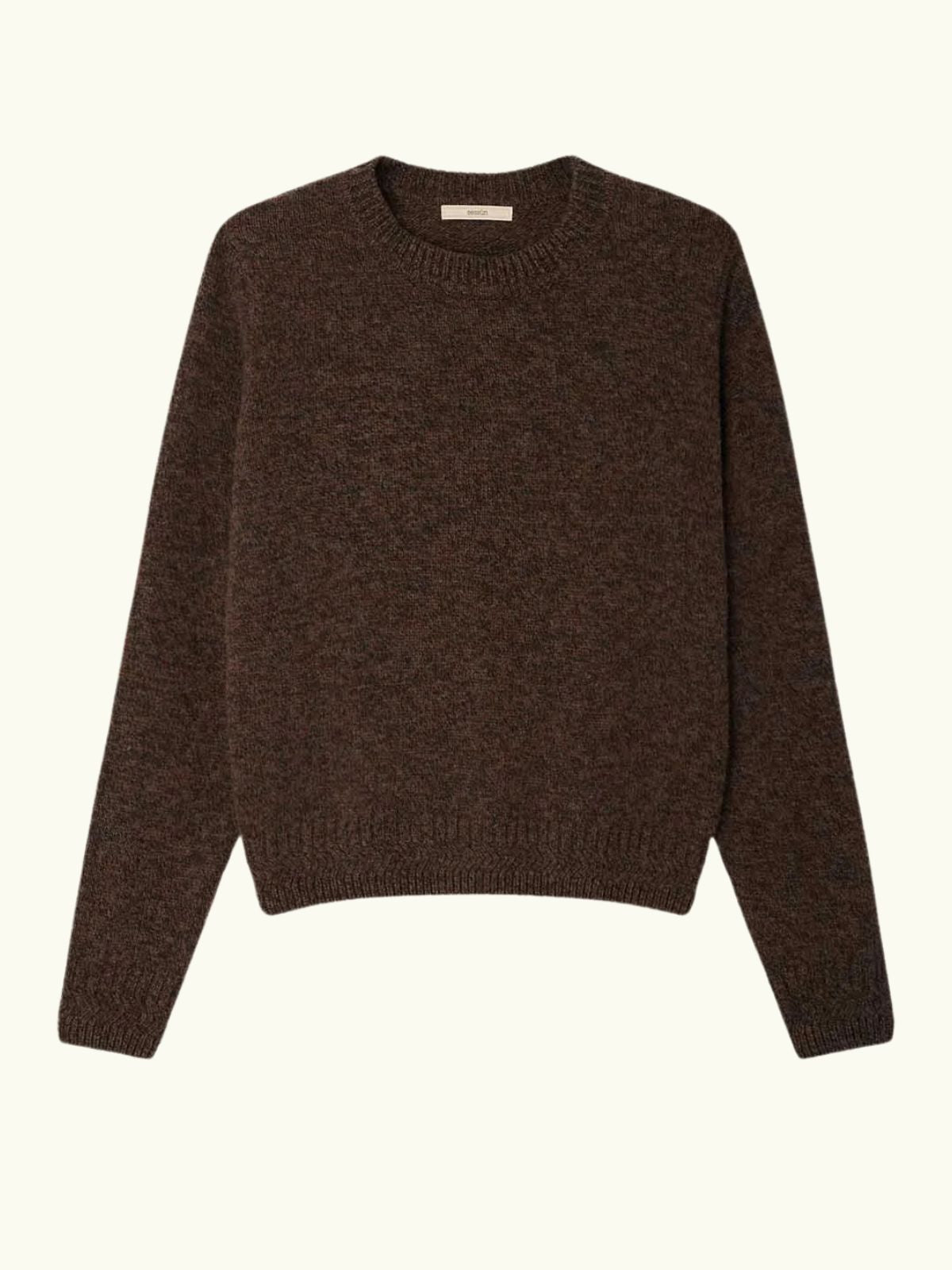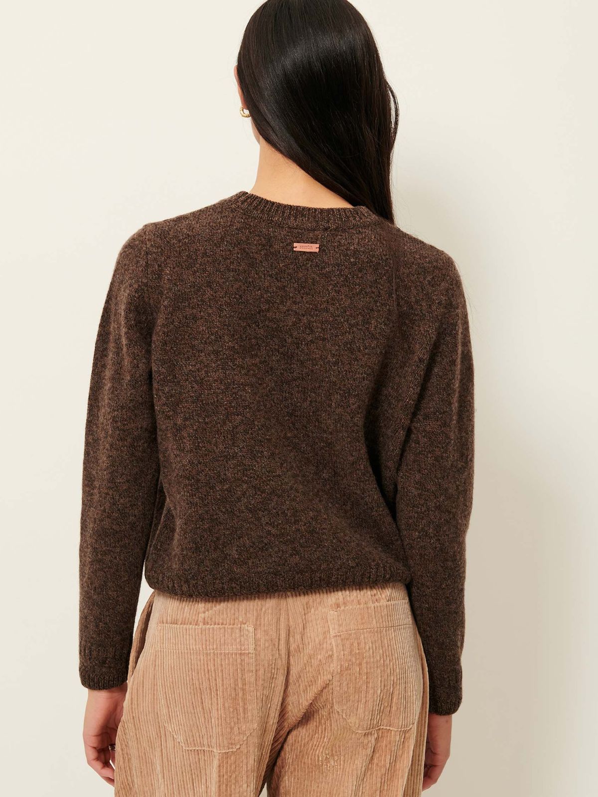 Crafted from soft mouliné Merino wool, the Silty Jumper in brown offers luxurious warmth and refined texture. Its decorative ribbed collar, cuffs, and hem add subtle elegance, while the signature Sessùn leather patch at the back provides a distinctive, polished detail. This jumper effortlessly combines comfort with sophisticated style for a timeless wardrobe staple.