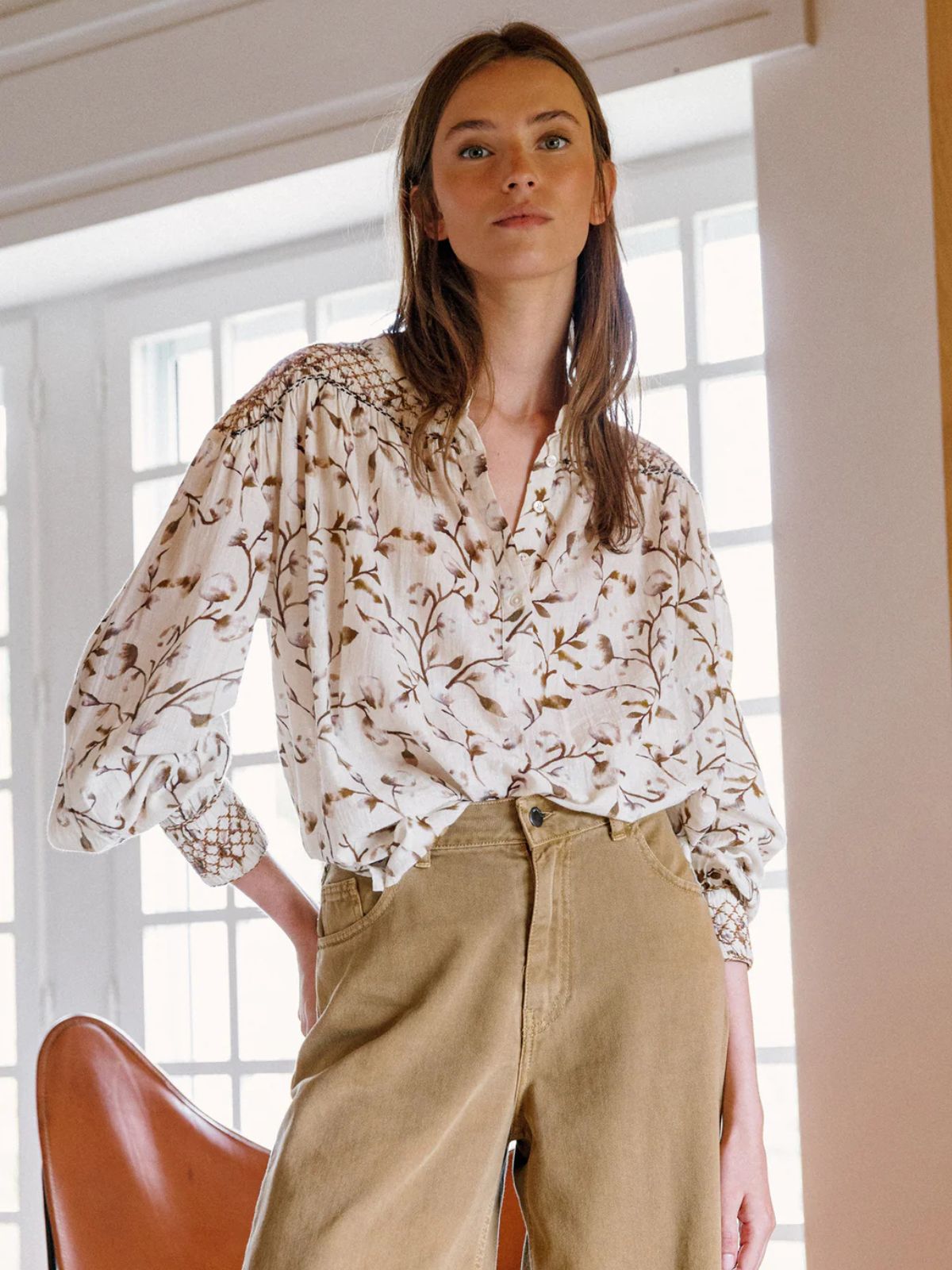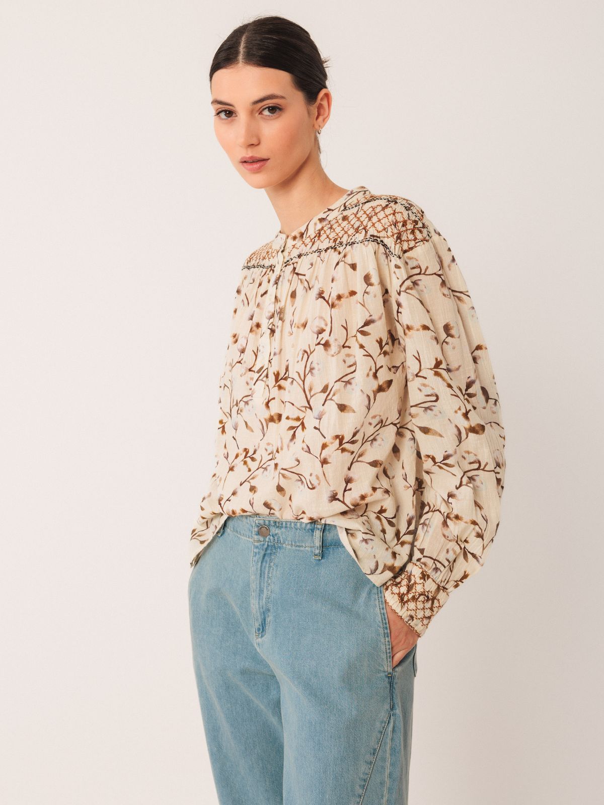 A structured blouse with hand-smocked shoulders and a slight hem that gives the garment a roomy feel. It has a half-placket closure and a relaxed fit you'll love.