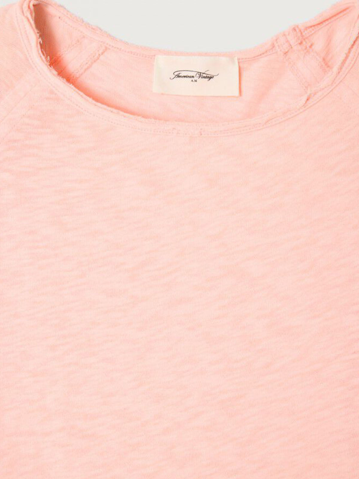 The American Vintage Sonoma T-shirt comes in a soft Vintage Camellia Pink shade. This long-sleeved cotton top features a wide neckline and a relaxed, straight cut. Made from thick cotton, it’s perfect for layering on cooler days. The raw edges on the neck and hem add a laid-back, effortlessly cool feel to this cozy tee.