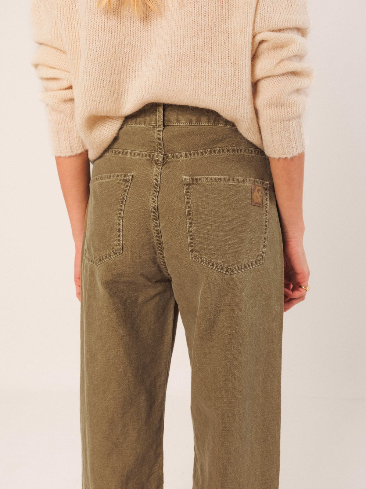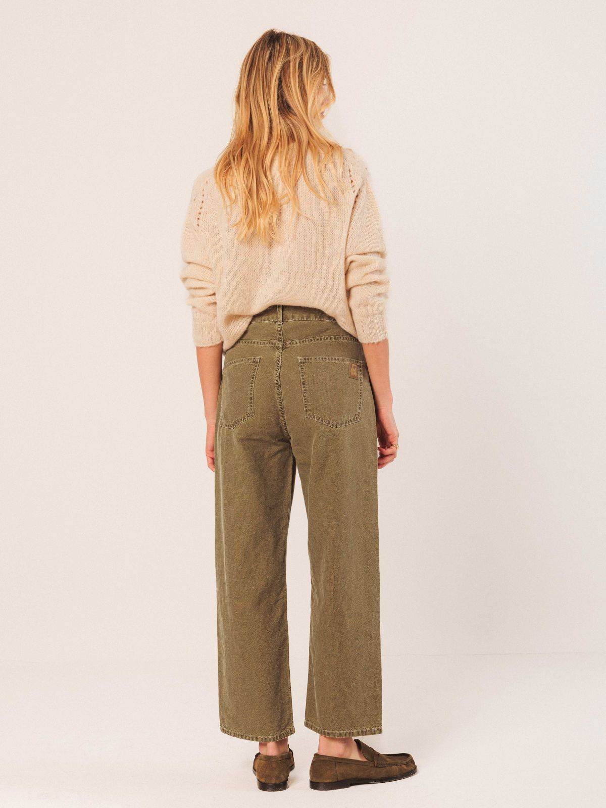 These Straight Leg Jeans in a refined washed olive green shade are crafted from washed cotton twill, offering a softly worn, lived-in appeal. Featuring a mid-rise waist and a tailored straight leg cut, they provide a flattering yet comfortable fit. Perfect for autumn styling, they pair effortlessly with the coordinating twill jacket to complete a chic laid back look. Also available in cherry.