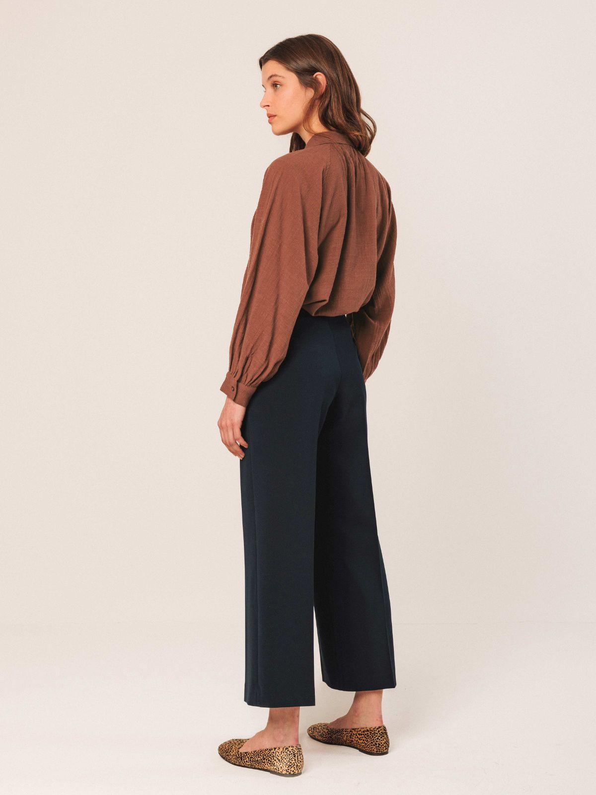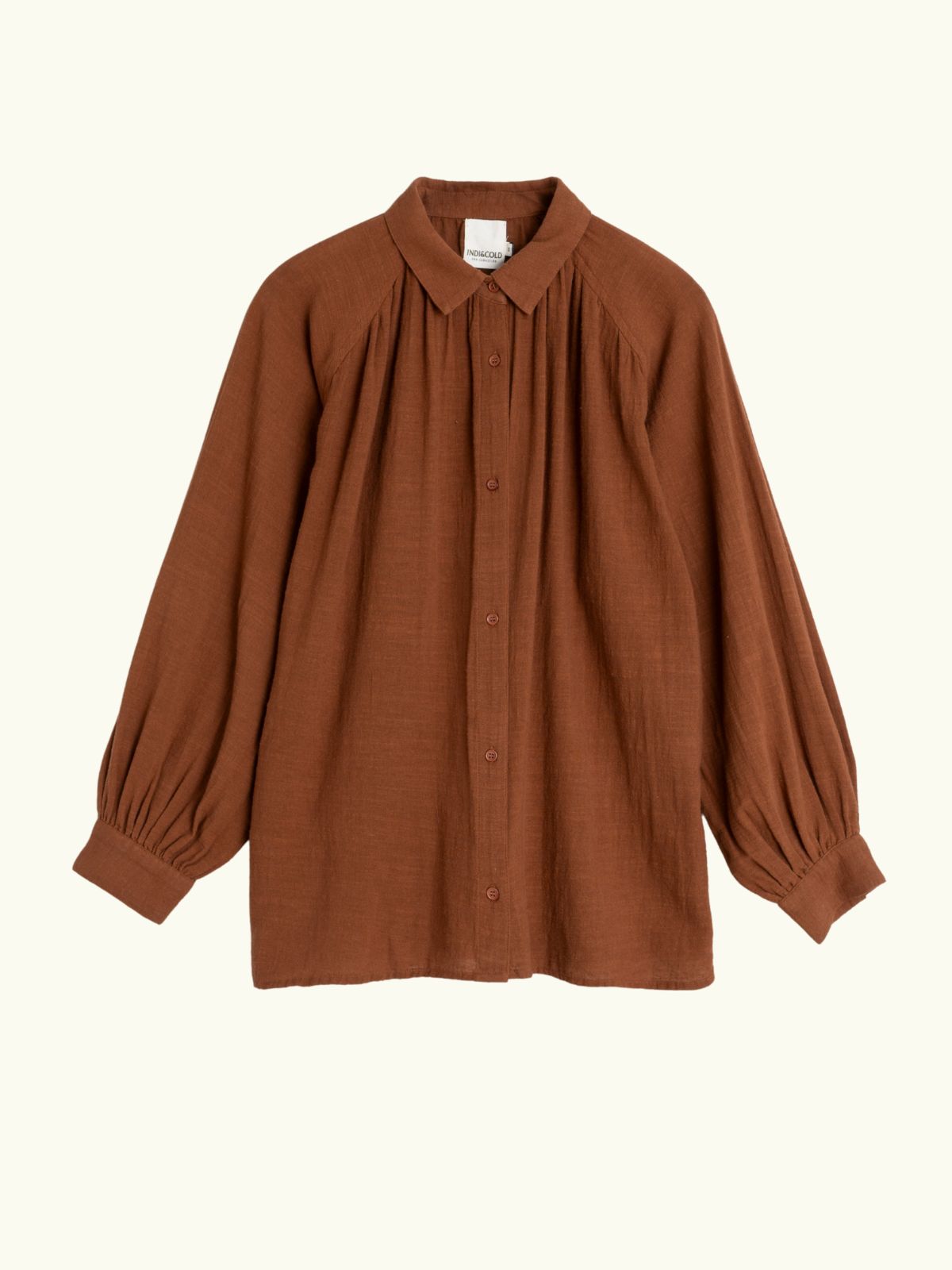 This Textured Cotton Weave Shirt in a gorgeous autumnal tobacco brown, combines elegant design with effortless comfort. Its raglan-cut sleeves and supportive collar create a flattering volume and graceful movement, while the soft crepe cotton gauze fabric offers a delicate texture and breathable feel, perfect for refined, everyday wear.