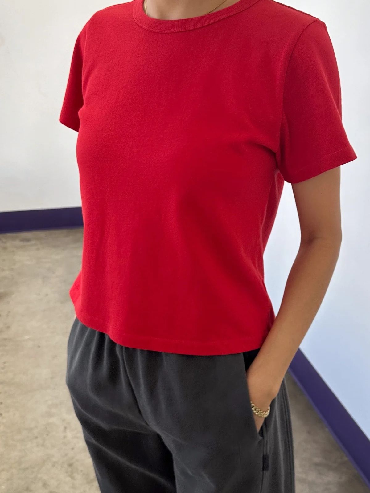 The quest for the perfect tee ends here! The Little Boy Tee uses medium-weight 100% cotton premium jersey blend for a flattering slim fit with just the right amount of stretch. It features baby ribbed details and maintains a suitable cropped length. Consider this little tee the perfect piece to remain a cherished part of your wardrobe season after season. Garment washed and dyed, each tee shows off a beautiful natural worn-in look.