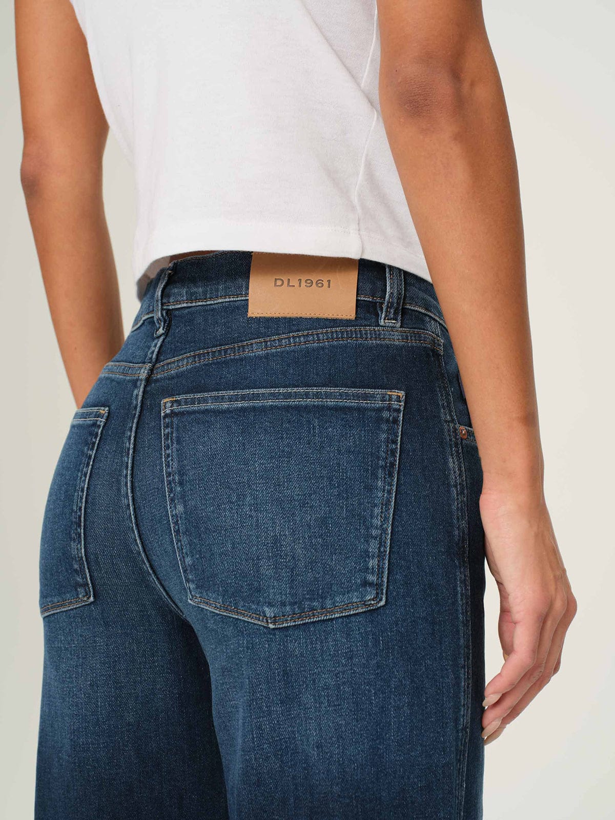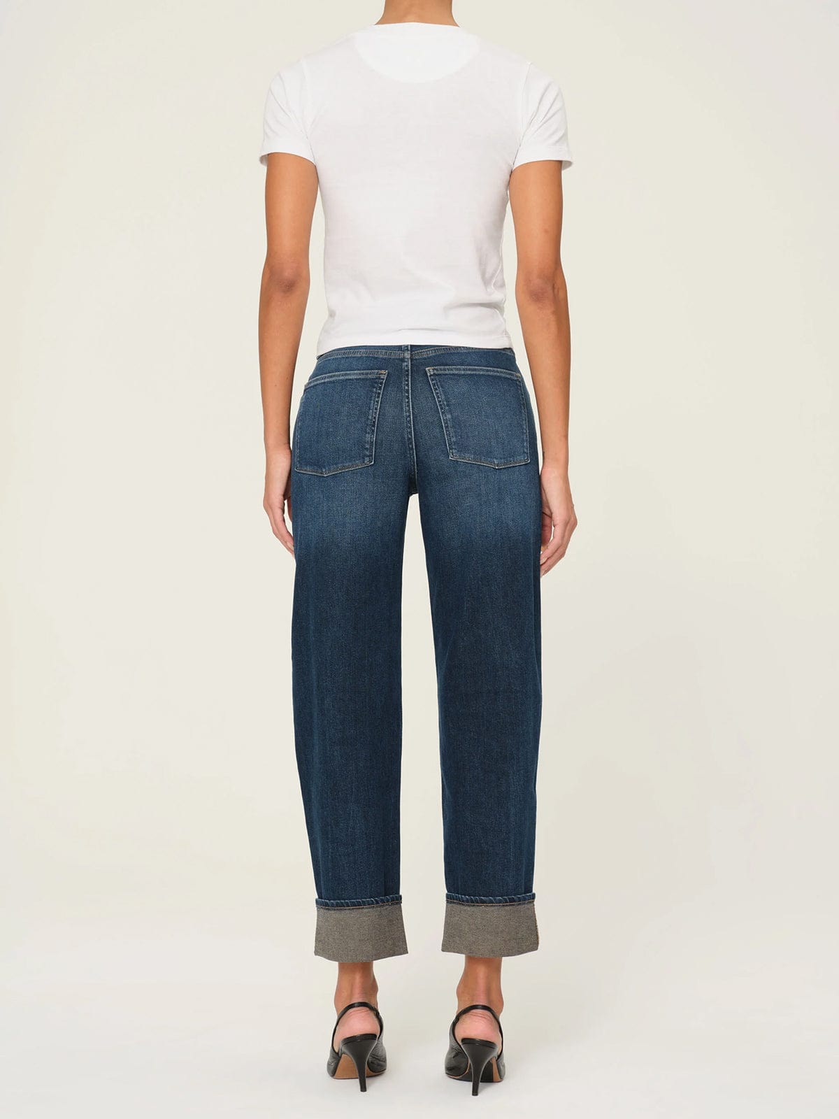 Thea is a relaxed boyfriend jean that sits low on the hips with plenty of room through the leg. Comes in the bluffview cuffed, colour-way which is a deep indigo blue wash with fading and whiskering. It features a shiny silver shank, matte copper rivets, multi-colored stitching, a functional cuffed hem and a brown back patch.