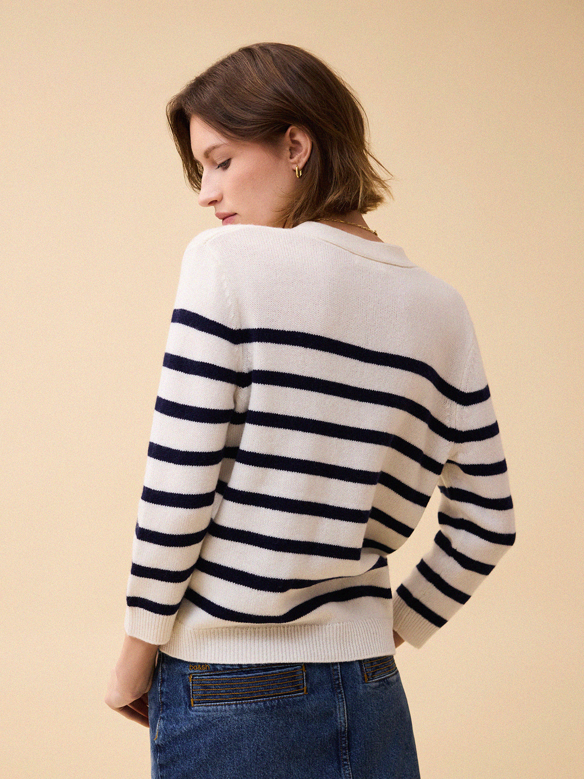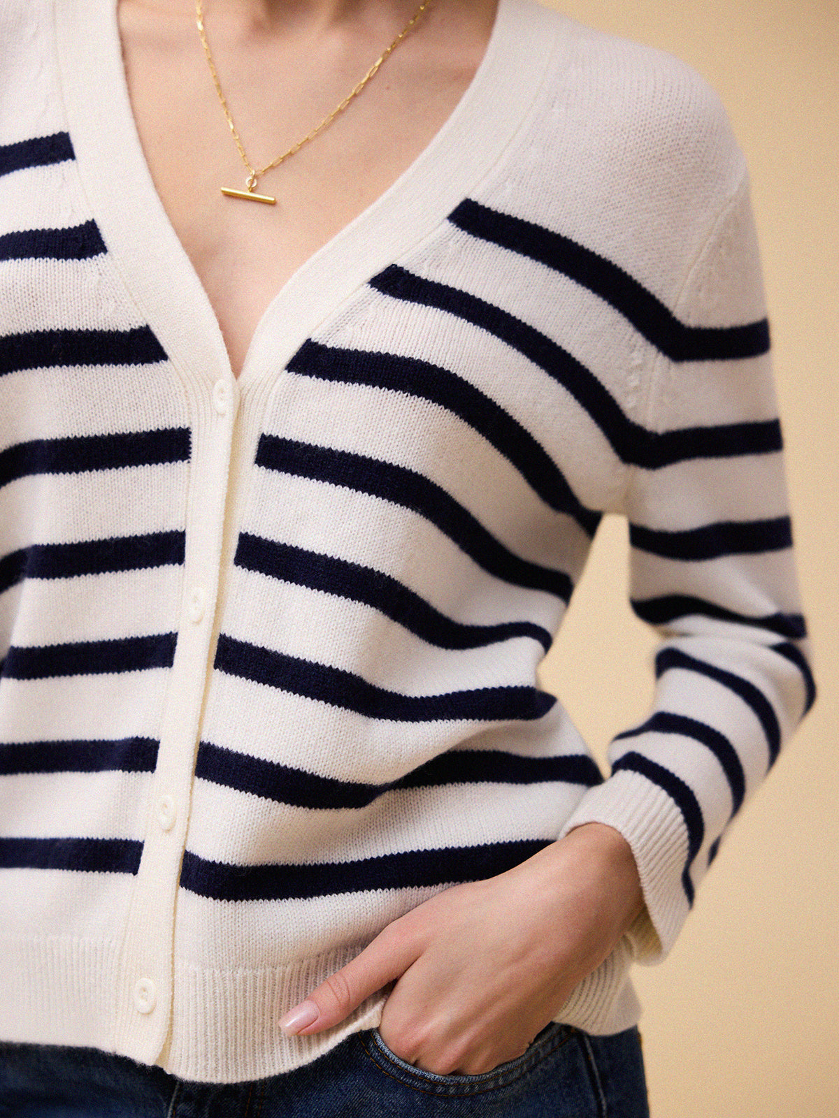 The Thea cardigan is an easy-to-wear, V-neck cardigan with a relaxed, cropped cut made from a super-soft cashmere blend. Brand new for this season she comes in a nautical inspired navy stripe showcased on a chic cream base.