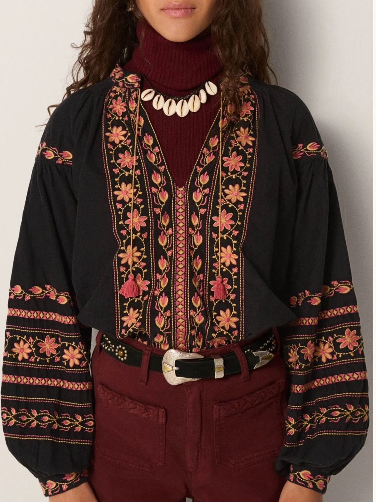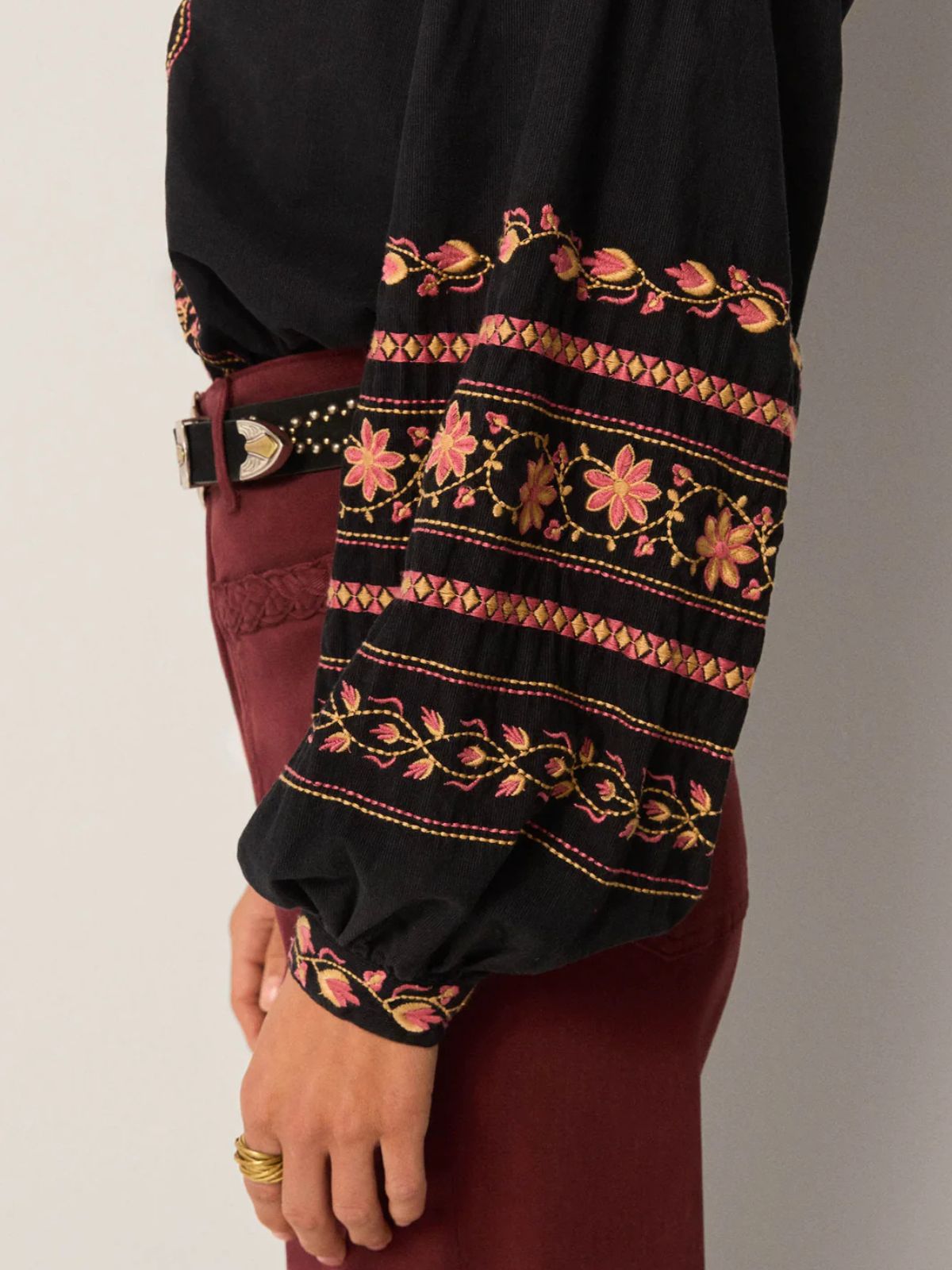 The Virginia Embroidered Top in night garden print is a playful twist on classic bohemian elegance. Crafted from lightweight cotton gauze, it drapes effortlessly and feels wonderfully soft. Beautifully detailed with rose, grape, and ochre florals embroidered on a black background, this top brings a chic, tapestry-like style to your wardrobe.