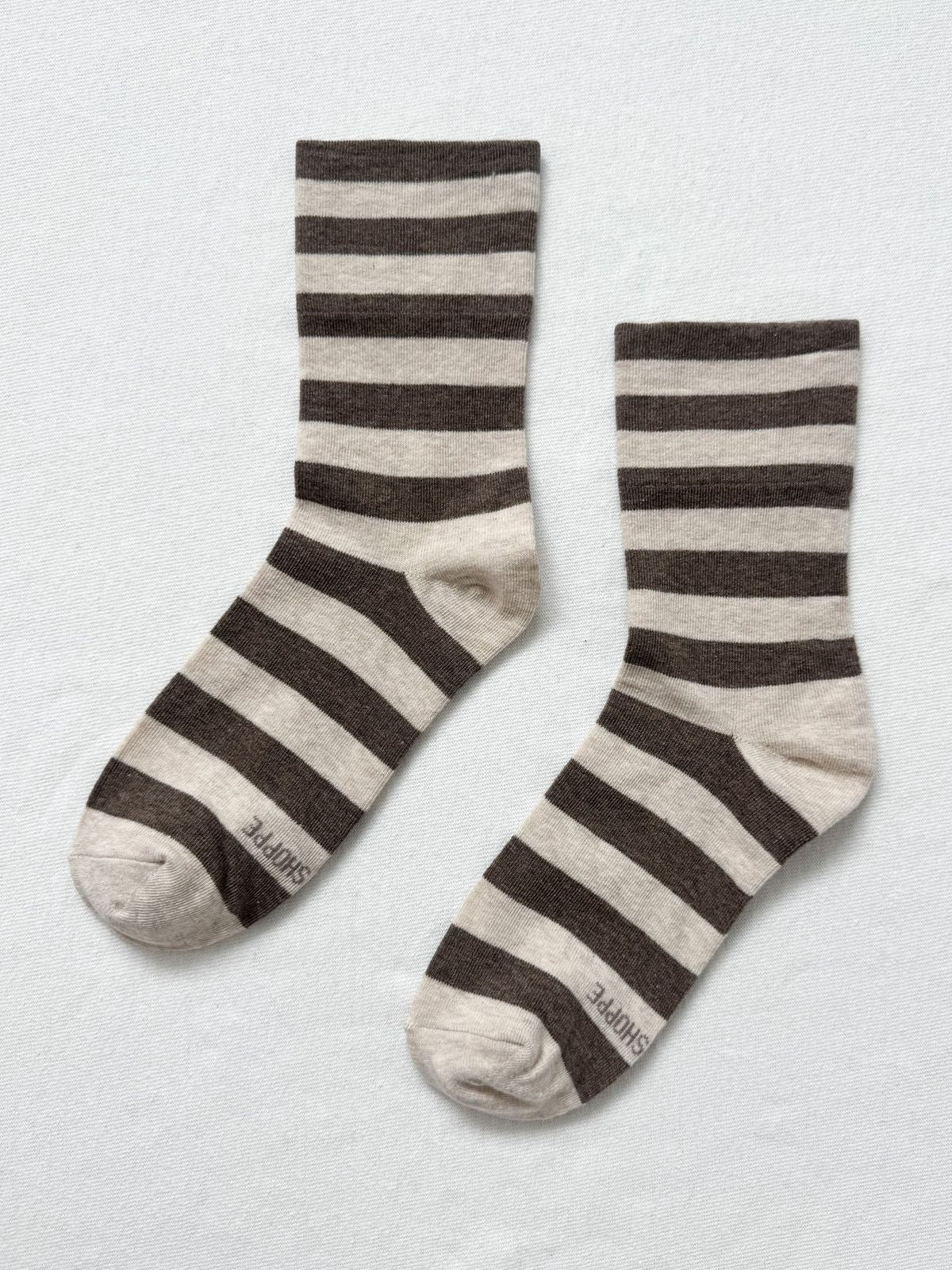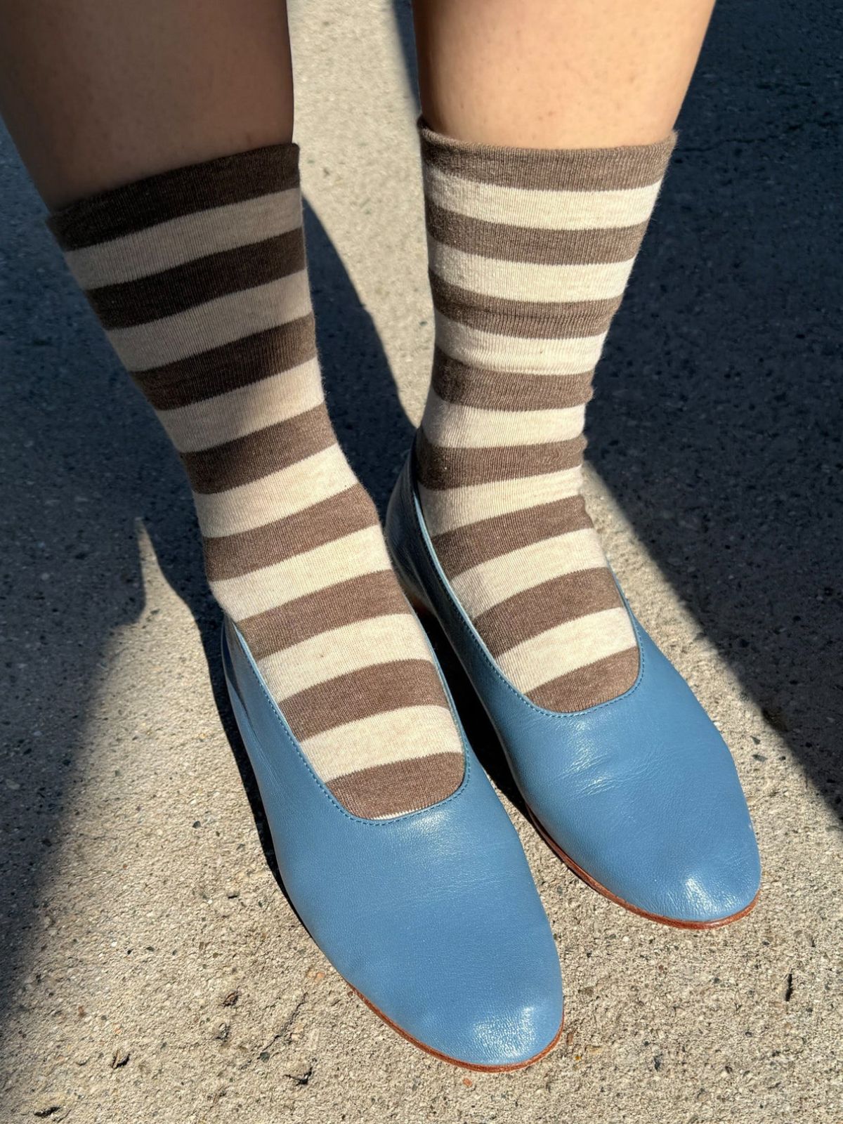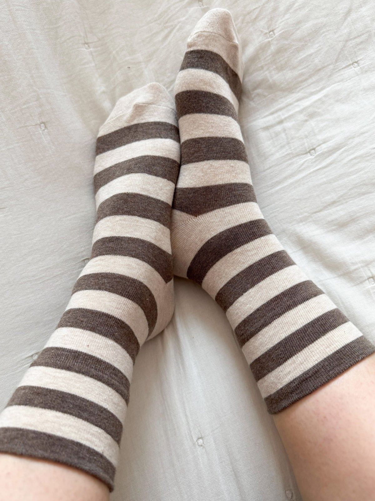The Wally Stripe Socks in brown offer timeless elegance with a Parisian twist. Crafted from a breathable cotton blend, these socks provide all-day comfort without leaving marks, thanks to their thick, gentle band. Perfectly versatile, they elevate any outfit effortlessly, making them an essential addition to your wardrobe for year-round wear.